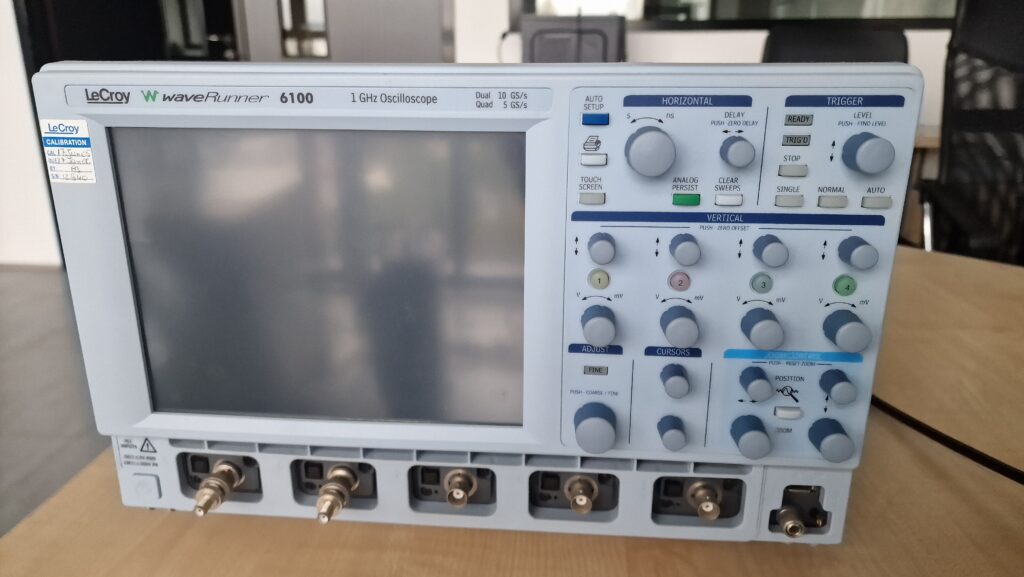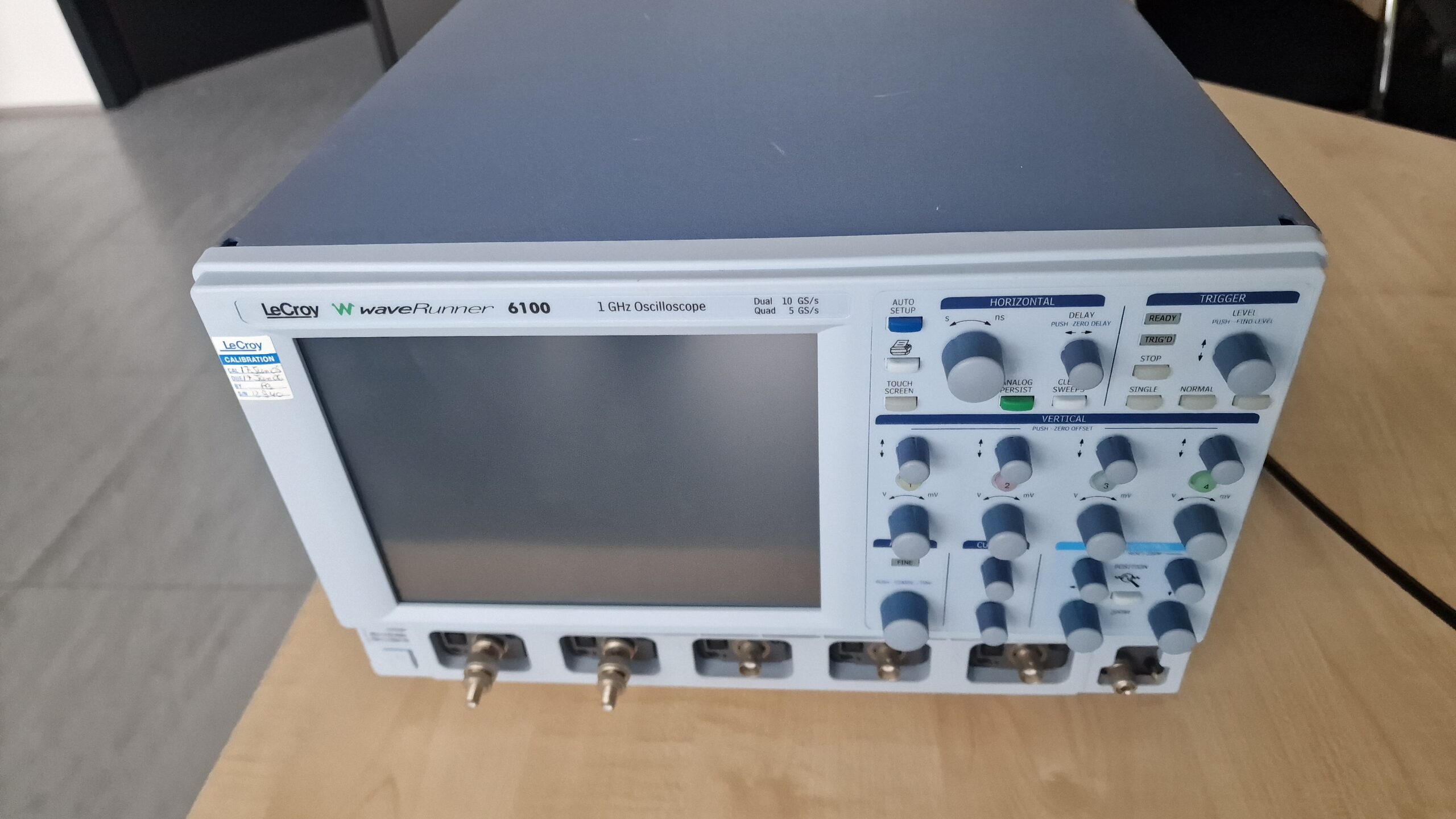 Oscyloskop Waverunner 6100 firmy LeCroy to zaawansowany technicznie system do akwizycji i analizy danych pomiarowych. Czterokanałowe urządzenie z pasmem rzędu 1Gz akceptuje różnorodne metody wyzwalania pomiaru w tym definiowane przez użytkownika. Oscyloskop wyposażony jest w kolorowy i dotykowy ekran o przekątnej 8,4” a także rozszerzalną pamięć pomiarów (z rozdzielczością maksymalną 16bit/punkt pomiarowy. Wbudowany system operacyjny Windows 2000 pozwala na uruchamianie dodatkowych aplikacji pomocnych w obróbce danych (np. Matlab).