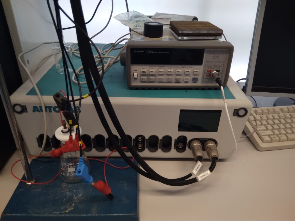 AutoLab PGSTAT 302N, czyli potencjostat-galwanostat. Stosowany do pomiarów elektrochemicznych, takich jak: woltamperometria pulsowa normalna, woltamperometria pulsowa różnicowa, woltamperometria liniowa, woltamperometria cykliczna, chronoamperometria, chronopotencjometria, kulometria, spektroskopia impedancyjna i inne. Jest również stosowany podczas zajęć laboratoryjnych ze studentami do badania korozji stali w układzie trójelektrodowym.