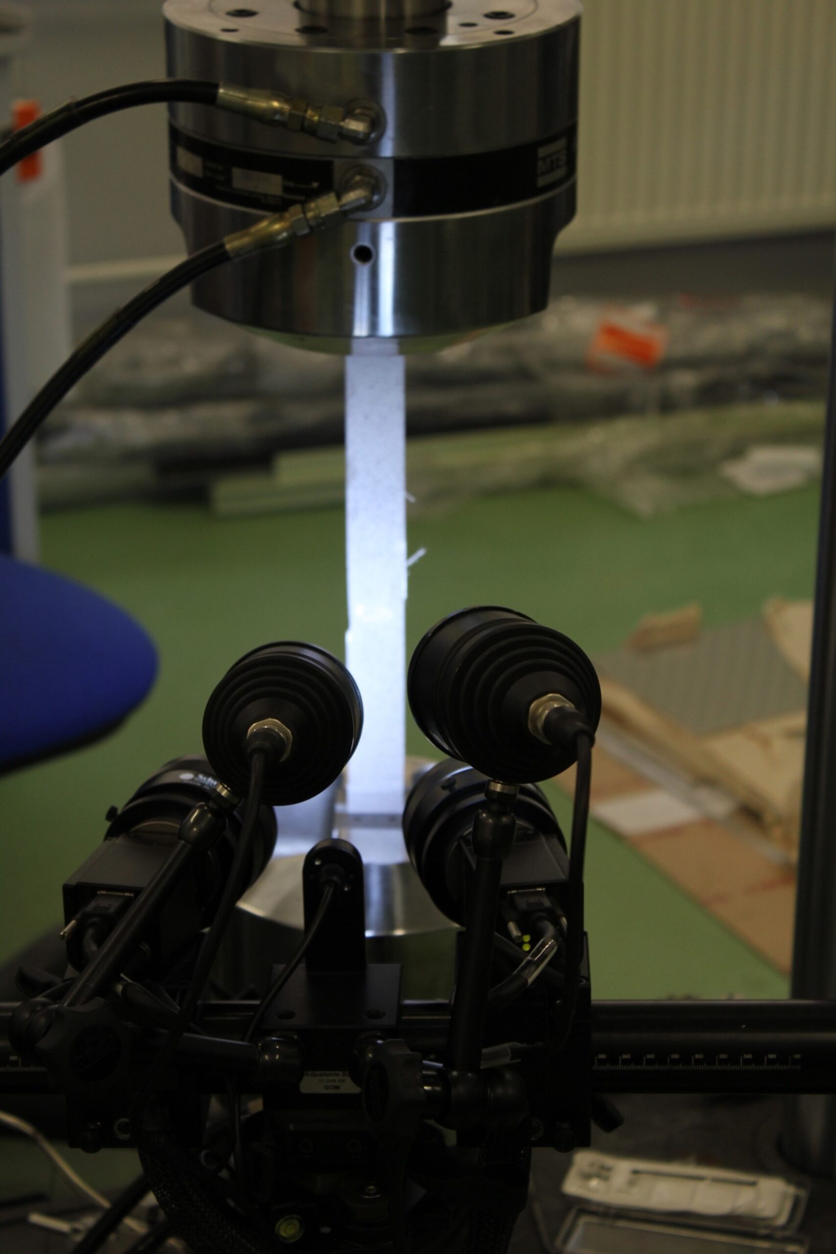 Skaner optyczny do pomiarów odkształceń trójwymiarowych działa na zasadzie cyfrowej korelacji obrazu. Dwie kamery obserwują badaną powierzchnię co pozwala odtworzyć położenie wszystkich punktów na niej leżących w przestrzeni trójwymiarowej. Obserwacje wykonywane są w trakcie obciążania materiałów na maszynie wytrzymałościowej co pozwala na określenie przemieszczeń a następnie obliczenia pełnego tensora odkształceń. Zebrane wyniki pozwalają na wyznaczenie modułu sprężystości podłużnej, współczynnika Poissona oraz określić miejsca, w których występuje lokalne wyboczenie