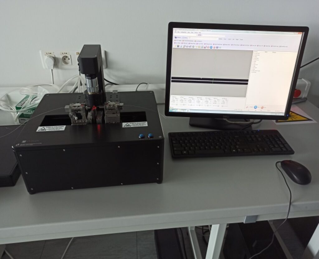 Wyposażenie: Komputer z oprogramowaniem, monitorem, klawiaturą i myszką, reduktor gazowy, pompa próżniowa, układ pomiaru naprężenia włókna,układ chłodzenia cieczą,