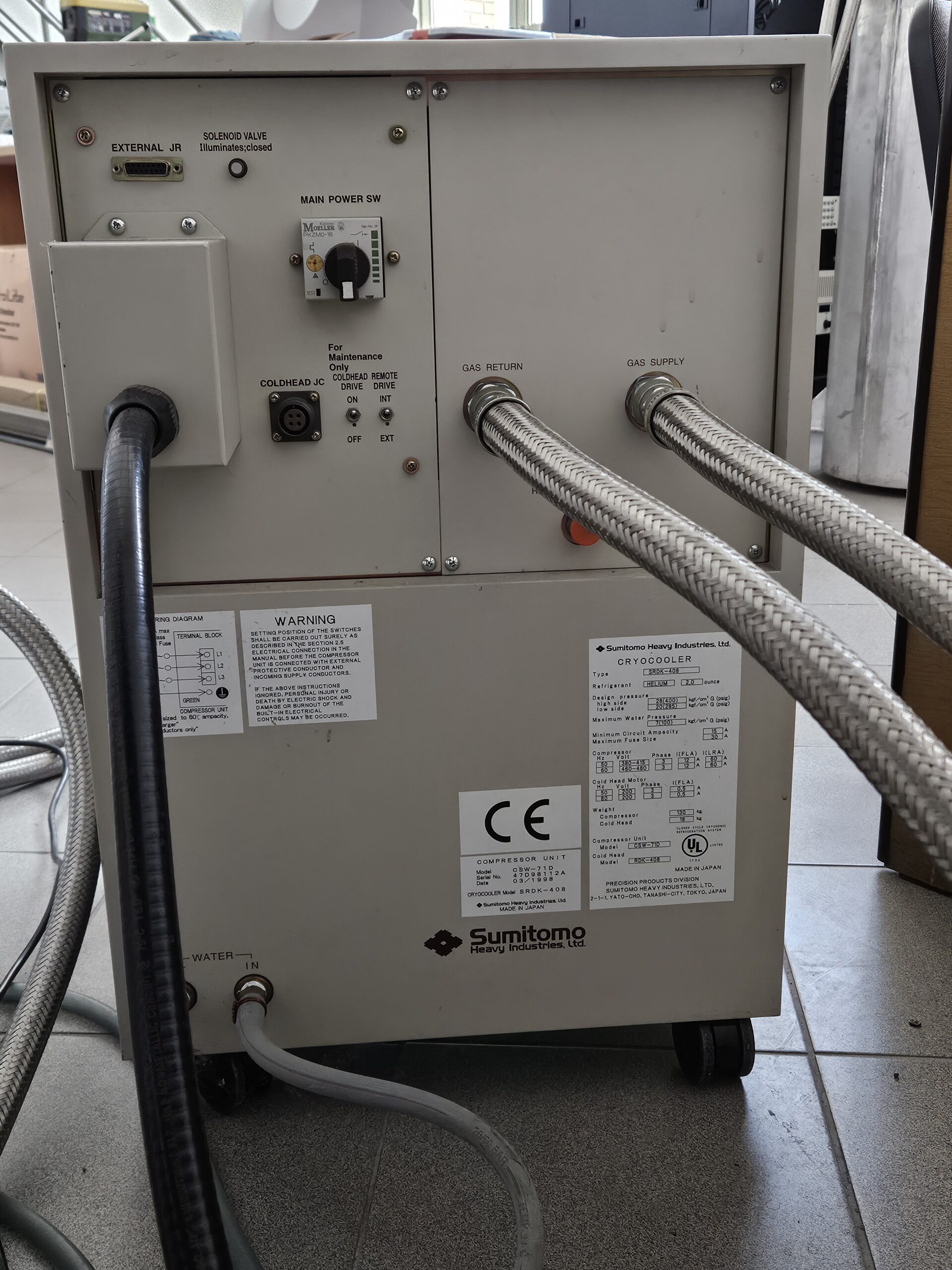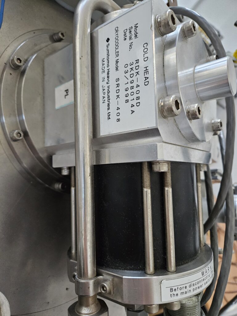 Głowica kriochłodziarki model: RDK-408D o mocy: 1- stopnień 40W@43K, drugi stopień 1W@4,2K. Kompresor helowy model: CSW-71. Moc kompresora 6,5kW . Kriochłodziarka przepracowała 1650h. Rok produkcji 1998. Masa kompresora 130kg, masa głowicy 18kg. Minimalny przepływ wody 7l/min. Długośc przewodów helowych pomiedzy głowicą i kompresorem 5m.