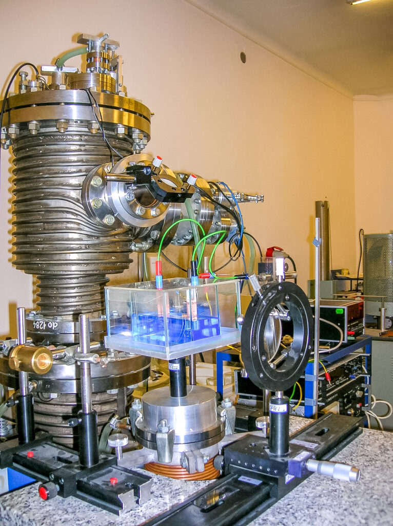 Nanoszenie cienkich warstw metalicznych metodą napylania próżniowego przy prożni bazowej 10-9 hPa. Rozmiary warstw od monowarstwy do warstw mikrometrycznych. Możliwość nanoszenia układów wielowarstwowych złożonych z różnych materiałów (Cu, Ag, Au, Ni). Wygrzewarka próżniowa o próżni bazowej 10-7 hPa wyposażona w stolik grzewczy. Zastosowane przepusty próżniowe umożliwiają podłączenie próżniomierzy niskiej i wysokiej próżni, termopary oraz zasilanie stolika grzewczego. Napylarka wysokopróżniowa umożliwia osiągnięcie wyjątkowo wysokich poziomów próżni, na poziomie rzędu 10–9 hPa. Układ zawiera elementy umożliwiające nanoszenie warstw metalicznych na podłoża krzemowe, takie jak przesłony, ceramiczne wyparowniki i kwarcowy monitor grubości. Dodatkowo, elementy optyczne, takie jak okno szklane i zwierciadła korygujące, pozwalają na skierowanie wiązki lasera układu optycznego do wnętrza komory. Do obsługi układu służy program, który analizuje obraz pochodzący z detektora i steruje położeniem zwierciadła obrotowego. Dodatkowo umożliwia wprowadzenie dowolnych parametrów układu pomiarowego (ogniskowa soczewki, długość skanu i liczba punktów w skanie, długość ramienia obracającego zwierciadło czy skok śruby mikrometrycznej). Dzięki dodatkowej karcie pomiarowej możliwy jest również odczyt temperatury próbki podczas osadzania warstwy i wygrzewania.