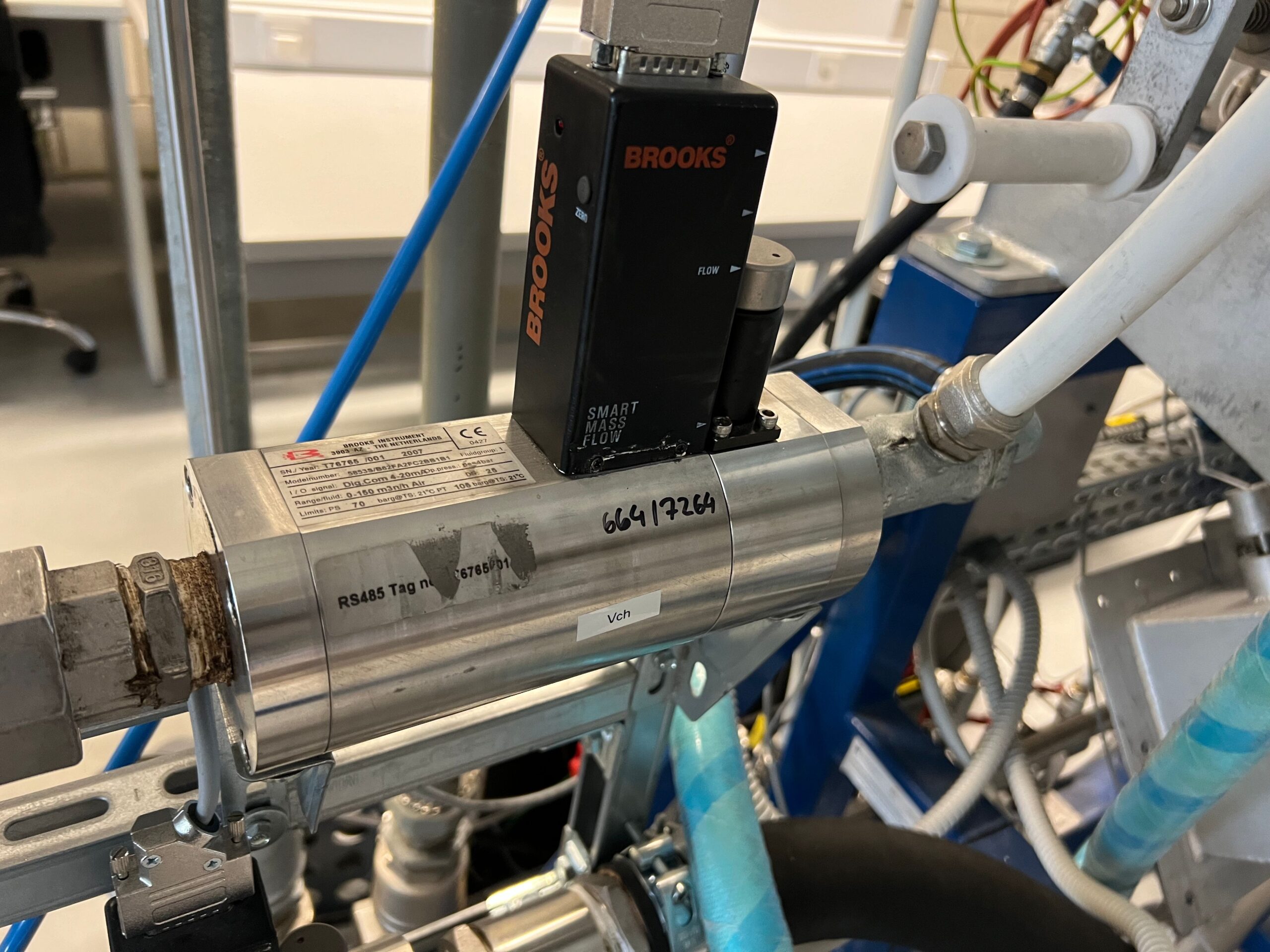 Masowy regulator przepływu gazu SLA5853 firmy Brooks. Umożliwia pomiar masowy zamiast objętościowego oraz regulację tego przepływu. Regulatory zabudowane w instalacjach pomocniczych Laboratoryjnej komory spalania i zgazowarki