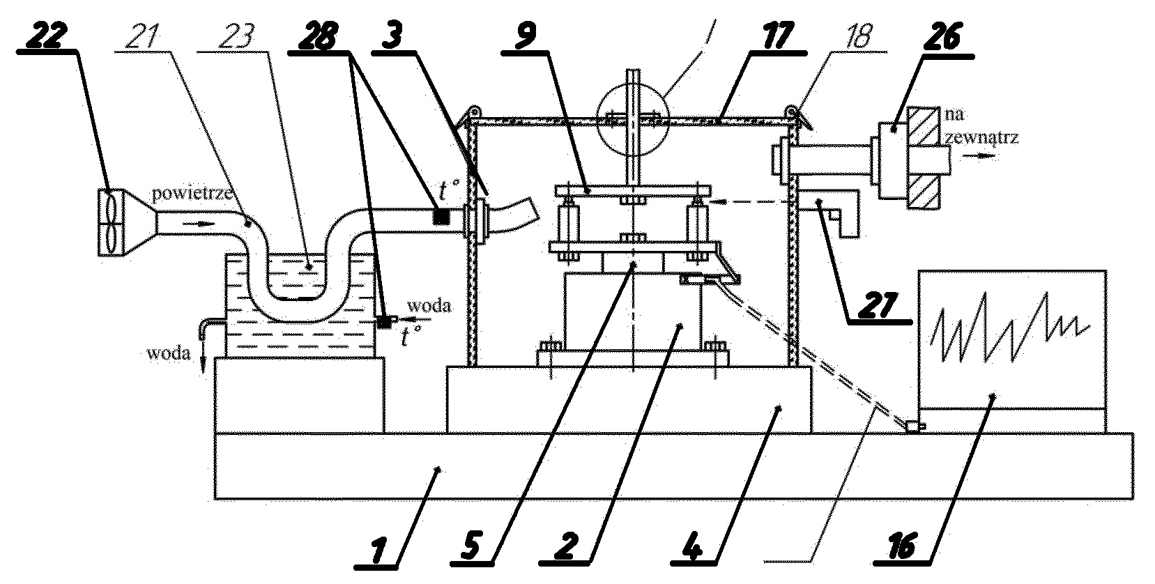 Urządzenie badawcze charakteryzuje się tym, że składa się z podstawy urządzenia (1), na której zamocowana jest na stałe płyta (4), do której zamocowany jest pojemnik (3) ze zdejmowaną pokrywą (17) składającą się ze ścianek obklejonych od wewnątrz wzdłuż obwodu uszczelką elastyczną. W zdejmowanej pokrywie (17) znajduje się pionowy wał uszczelniony podkładką wykonaną z materiału elastycznego. Do części dolnej wału zamocowana jest przeciwpróbka (9) w kształcie tarczy. Obudowa (2) z łożyskiem tocznym ma oś obrotową (5), do której jest przymocowana tarcza, na której symetrycznie zamocowane są jednakowe uchwyty z próbkami. Przeciwpróbka (9) w kształcie tarczy jest osadzona na wale z napędem zewnętrznym. Do ścianki bocznej pojemnika (3) zamocowana jest rura wlotowa, do której zamocowane są czujniki temperatury (28). Na końcu rury wlotowej zamocowana jest sprężarka (22). Do przeciwległej ścianki pojemnika (3) zamocowany jest pirometr (27), powyżej którego zamocowany jest wylot powietrzny (26), który jest połączony z pojemnikiem (3) za pomocą rury wylotowej. Na tarczy zamocowany jest drążek dociskowy, poniżej którego znajduje się belka tensometryczna, na której umieszczony jest czujnik tensometryczny, który jest połączony ze wzmacniaczem. Urządzenie badawcze połączone jest przewodem do komputera (16).